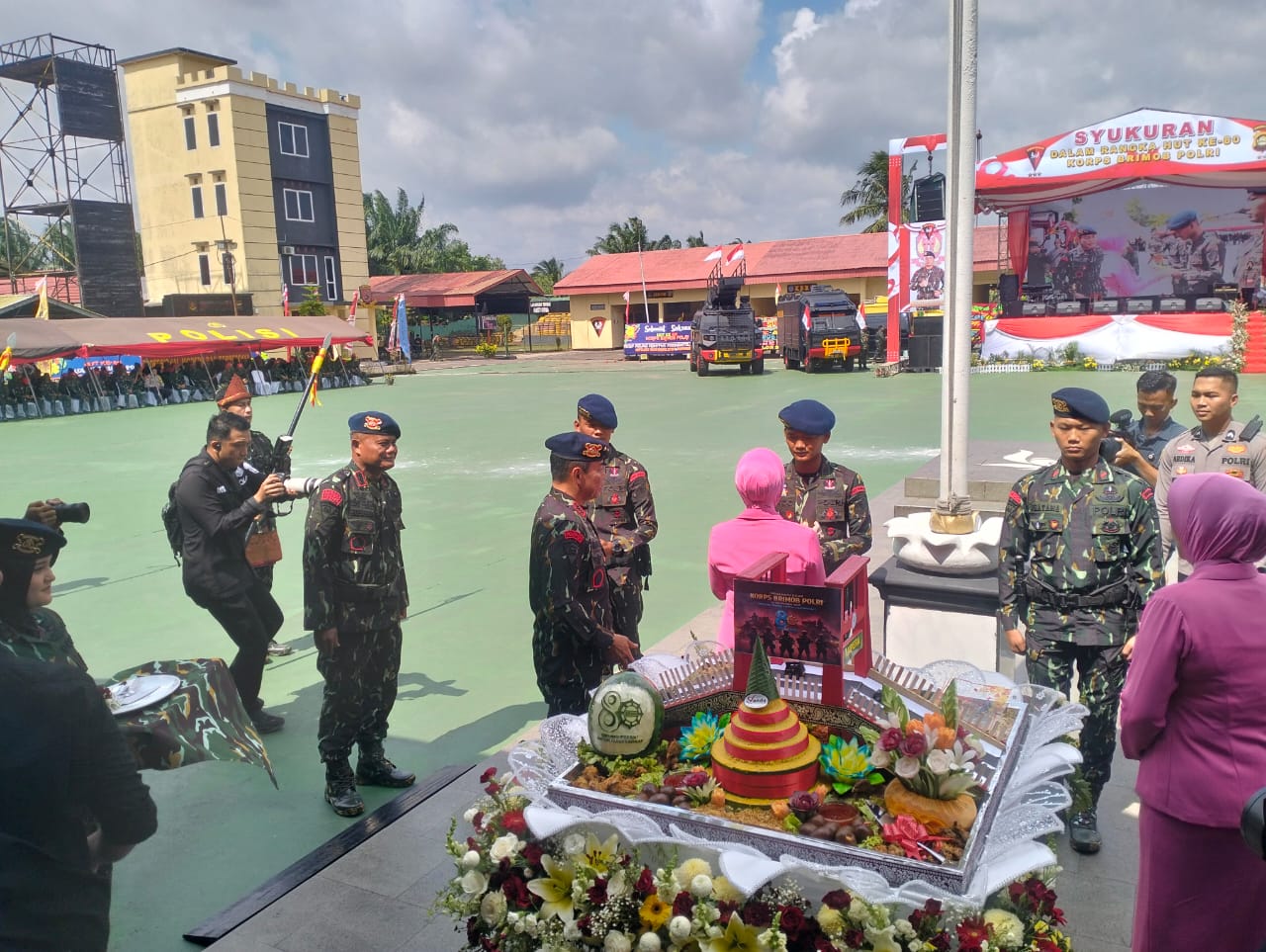 Prosesi pemotongan tumpeng oleh Kapolda menjadi puncak acara. Potongan tumpeng diserahkan kepada perwakilan personel Satbrimob sebagai simbol rasa syukur dan kebersamaan.